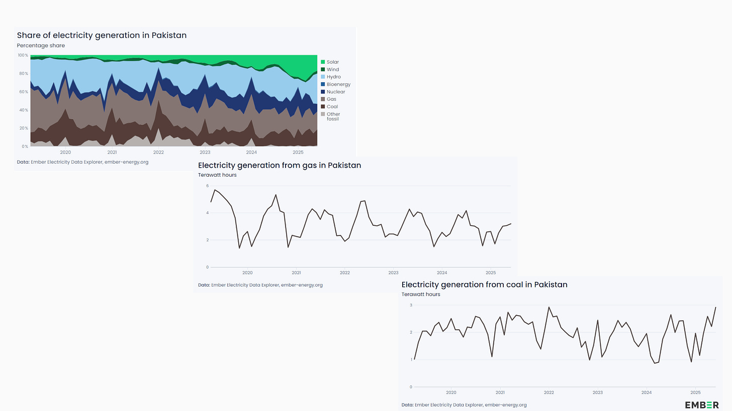 C’est sur le fait que le solaire peut se substituer à très court terme aux fossiles que McKibben est le moins convaincant. Lui met en avant le cas de la Californie qui en deux ans aurait réduit de 44 % sa consommation de gaz dans la production d’électricité grâce à l’installation de gigantesques batteries et de panneaux solaires. Ce chiffre vient des travaux de Mark Jacobson, à Stanford, qui « scrappe » chaque jour les données mises en ligne par le gestionnaire de la principale grid de l’Etat (CAISO). Quand on prend les statistiques agrégées de l’Agence d’information sur l’énergie (EIA) ou bien d’autres proxys (livraisons de gaz, etc.), on constate une baisse de moindre ampleur (autour de 26 %). Il reste aussi à voir si cette comparaison entre les premiers mois de 2023 et les premiers mois de 2025 se confirme dans le temps. De la même manière, McKibben vante la ruée solaire du Pakistan et il est vrai que les chiffres montrent une croissance très rapide, mais le gaz et le charbon persistent.