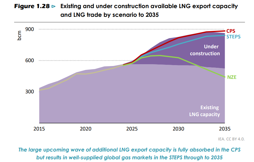Un graphique tiré du World Energy Outlook de l’AIE que je trouve très parlant. Les capacités d’export du gaz naturel liquéfié déjà existantes et en construction avec ce qu’il faudrait suivre selon les trois scénarios. Dans le Net Zero, une bonne partie de ces infrastructures ne serait plus ou pas utilisée.