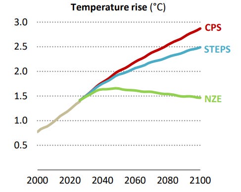 L’autre effet qu’a l’inclusion du scénario Current Policies est de rendre acceptable celui du Stated Policies, qui n’est guère plus reluisant puisqu’il nous amène à + 2,5 °C en 2100. Le scénario Announced Pledges, publié l’année dernière – celui dans lequel les Etats suivraient leur feuille de route climatique – était beaucoup plus sympathique, nous amenant à + 1,7°C en 2100. Mais il repose sur les déclarations de pays dont le track record, pour parler comme les banquiers, n’inspire pas confiance. Pour respecter pleinement nos objectifs climatiques, il faudrait suivre le scénario Net Zero et le graphique ci-dessous vous donne une idée du fossé à combler. A ce propos, l’AIE note cette année que rester en dessous de + 1,5°C n’est plus possible sans un overshoot – si ce terme ne vous est pas familier, vous pouvez lire ce précédent épisode de la newsletter – et donc sans des aspirateurs à CO₂, une technologie qu’elle juge elle-même « coûteuses et non éprouvées à grande échelle »…