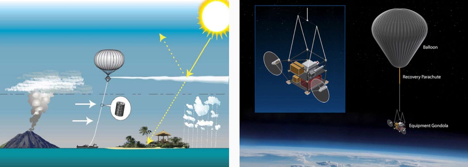 Au début des années 2010, un groupe réunissant des chercheurs des plus prestigieuses universités anglaises (Bristol, Oxford, Cambridge, etc.) envisage le déploiement, à environ un kilomètre d’altitude, d’un ballon relié à un tube d’injection. C’est le projet Stratospheric Particle Injection for Climate Engineering (SPICE). Ses initiateurs entendent vaporiser de l’eau dans l’atmosphère – l’équivalent de deux baignoires – pour tester le dispositif. Mais la controverse soulevée et une sombre histoire de brevets mènent à son annulation.