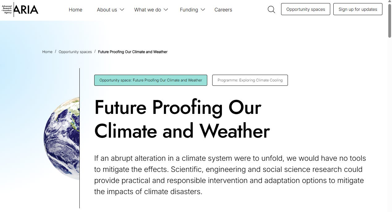 C’est de cette institution toute neuve, sentant encore le plastique de l’emballage, qu’est venue ces derniers jours une nouvelle qui a traversé le monde de la géo-ingénierie comme un souffle d’espoir. Deux des huits axes de l’agence concernent le climat : l’un vise à anticiper les points de bascule – en particulier le ralentissement des courants de l’Atlantique (AMOC) qui pourrait dévaster la Royaume-Uni –, l’autre à refroidir la planète.