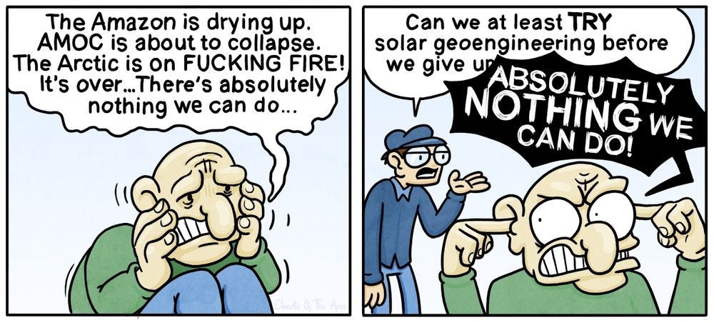 Mémétique. La géo-ingénierie fait désormais l’objet de nombreux mèmes de la part de ceux qui aimeraient que nous explorions cette voie. Peut-être que la défense du voile solaire se fondera un jour dans la culture lolesque et subversive de l’alt-right, tandis que la défense de la sobriété sera violemment caricaturée.