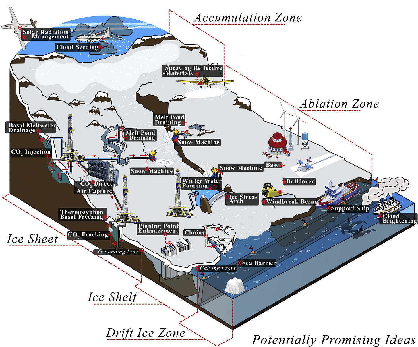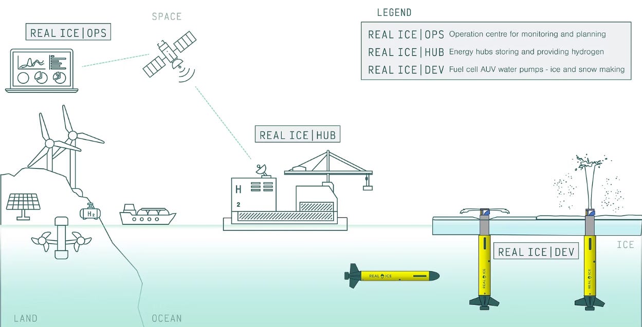 La start-up britannique Real Ice veut par exemple déployer des drones sous-marins, fonctionnant à l’hydrogène, qui viendraient perforer la banquise et répandre de l’eau à la surface. Après avoir testé différentes poudres dans des piscines, l’Arctic Ice Project, une ONG de la Silicon Valley, prévoit quant à elle de saupoudrer une petite zone (1km2) d’un fjord du Svalbard d'ici 2028. Une autre organisation, la Bright Ice Initiative, elle aussi basée en Californie, a fait des tests semblables en Islande.